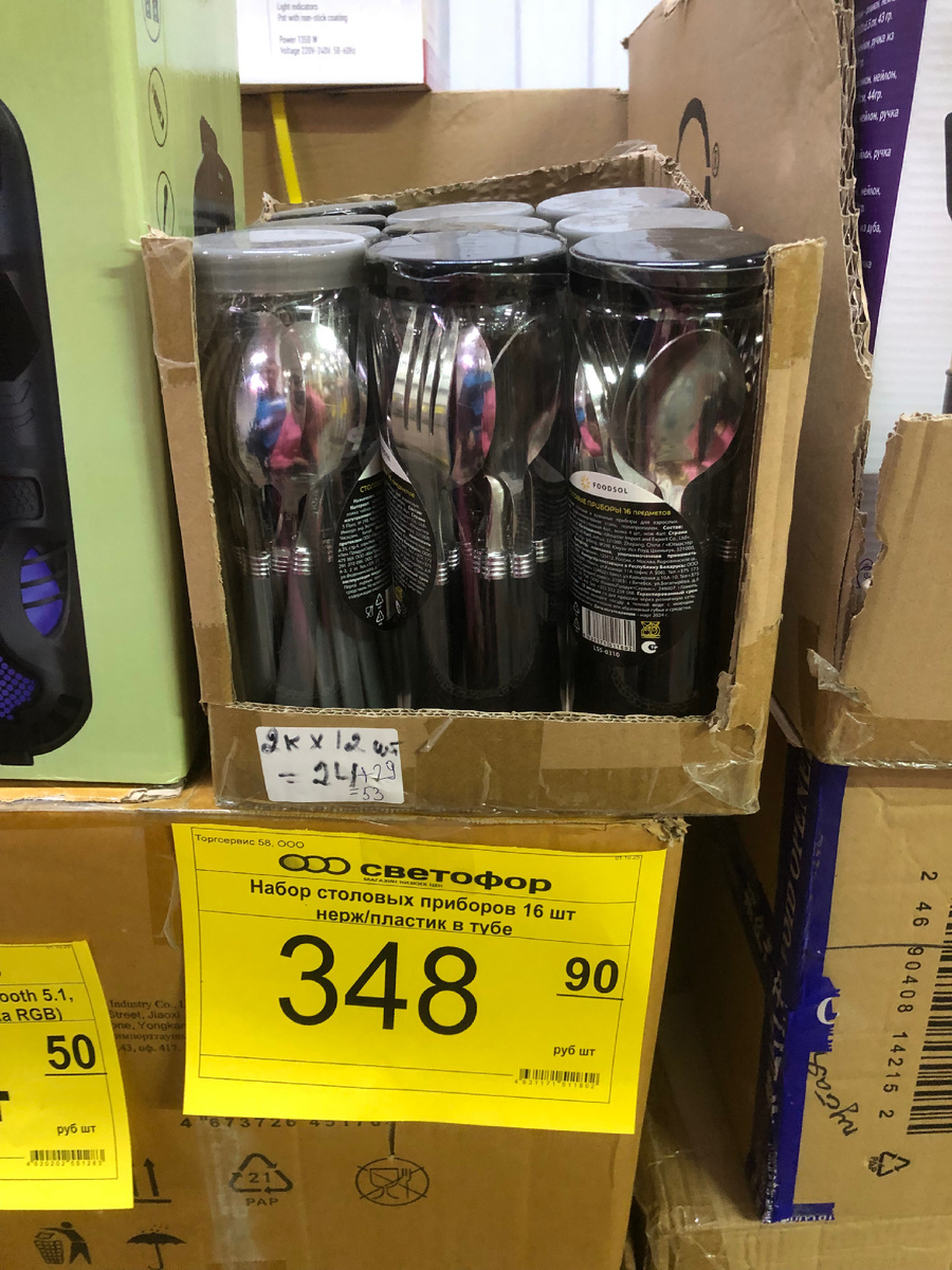 - Набор столовых приборов (16 предметов) из "чего-то там" и пластика. Цена: 348 рублей. Ну что сказать, вилки и ложки есть. Пластик, нержавейка - главное, чтобы еда в рот попадала! Идеально для дачи, общаги или если ваша жена решила, что пора обновить сервиз, потому что "эти ложки не подходят к моему новому настроению".