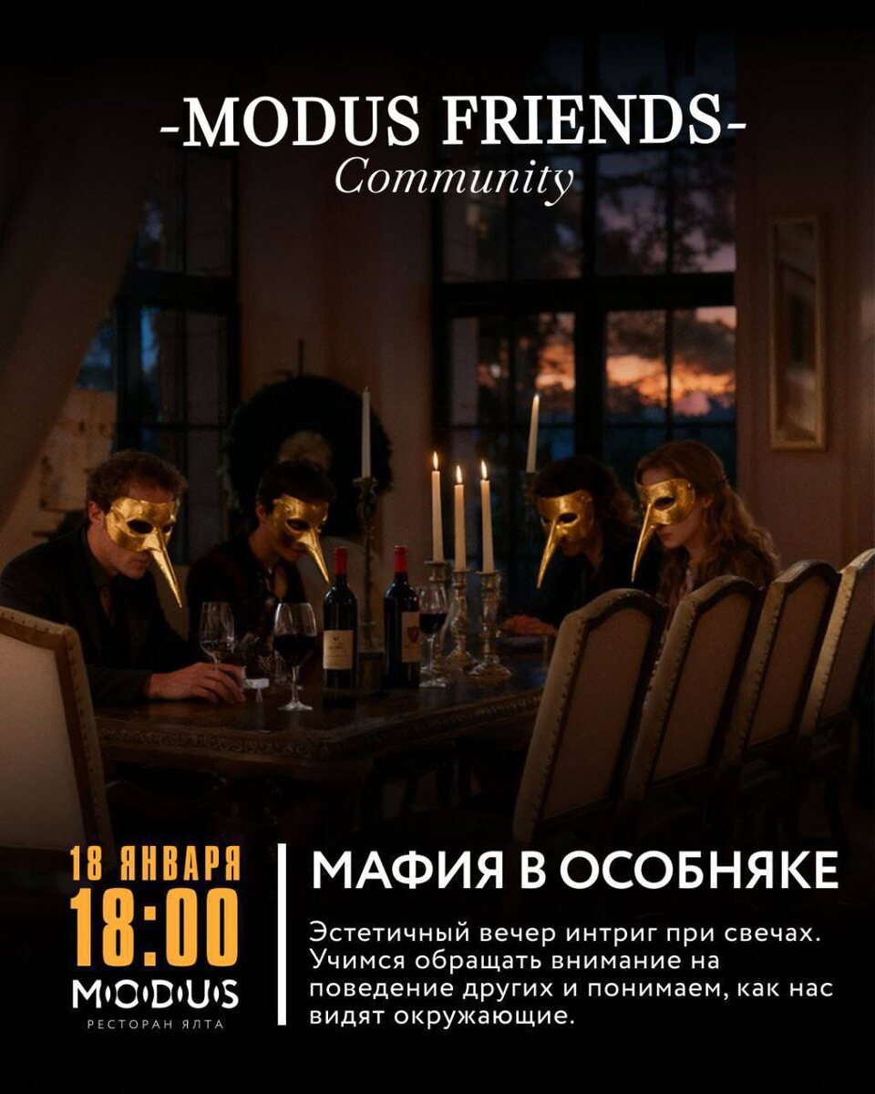 » Атмосфера — как в кино: свечи, интрига, тайные взгляды и ощущение, будто ты действительно внутри заговора. Возвращаемся туда, где каждый скрывает правду за улыбкой. Мафия — это не просто игра. Это тренировка интуиции, наблюдательности и умения чувствовать людей. А ещё — отличный способ провести вечер. 👉 Когда? 18 января в 18:00 👉 Где? 📍Ялта, ресторан MODUS, Горная 9Б 👉 Бронь: +7(978)813-10-33 ✨Давай сходим | Крым