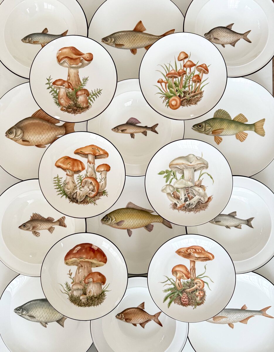 Дары природы средней полосы России… Лесные грибы, речная и озерная рыба. Обожаю эту тему. Что может быть душевнее прогулок по лесу за грибами или неспешных посиделок с удочкой на берегу живописного озера). Эти работы объединяет еще и то, что все герои - грибы и рыбы - изображены реалистично, как они есть в природе. Не схематично и не на память. В качестве образцов использованы научные ботанические атласы. В целом, тема грибов и рыб, конечно, очень гастрономическая, но когда они выглядят, как живые, это приобретает уже совсем иной смысл и значение). Такая роспись придется по душе настоящим любителям дикой природы и хорошо вписывается в экостиль. В набор входят тарелки разного размера и назначения. Глубокие суповые диаметром 23 см (с рыбами), тарелки для второго - 20 см (с грибами) и диаметром 25 см (рыбами). Расписано на заказ на фарфоре Wilmax. При желании сервиз можно расширить другими предметами - салатницы, различные сервировочные блюда и даже фарфоровая супница. В этом и преимущ