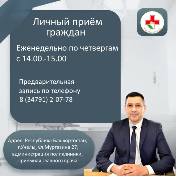 ! Главный врач Учалинской ЦРБ Юсупов Ильгиз Тагирович еженедельно по четвергам проводит личный прием граждан. По четвергам. 14.00-15.00. Личный прием граждан проводится по предварительной записи, записаться можно по телефону:8(34791)2-07-78. Ждем Вас! Ваше здоровье — наш приоритет. Источник https://uchaly102.ru/?p=120345