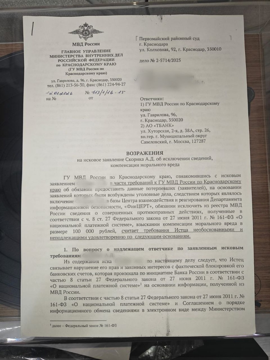 Получили возражения от ГУ МВД по Краснодарскому краю на иск гражданина, чьи счета заблокировали по 161-ФЗ из-за попадания в базу данных ЦБ. Позиция ведомства — классический пример перекладывания ответственности. Давайте разберем, почему их доводы несостоятельны. Тезис МВД №1: «Мы ненадлежащий ответчик» 🧐 * Позиция МВД: «Мы не блокировали счета. Мы просто передали информацию в Центробанк в рамках закона. Все вопросы к ЦБ и вашему банку, который нажал кнопку». * Почему это лукавство: МВД является первоисточником проблемы. Именно их информация, переданная в ЦБ, стала спусковым крючком для блокировки. Без действий сотрудников полиции никакой блокировки бы не было. Они — неотъемлемое звено в причинно-следственной связи, которая привела к нарушению прав гражданина. Утверждать, что они «просто информировали», — это попытка уйти от ответственности за последствия своих действий. Тезис МВД №2: «Вы не доказали моральный вред» ⚖️ * Позиция МВД: «Гражданин не представил медицинских справок