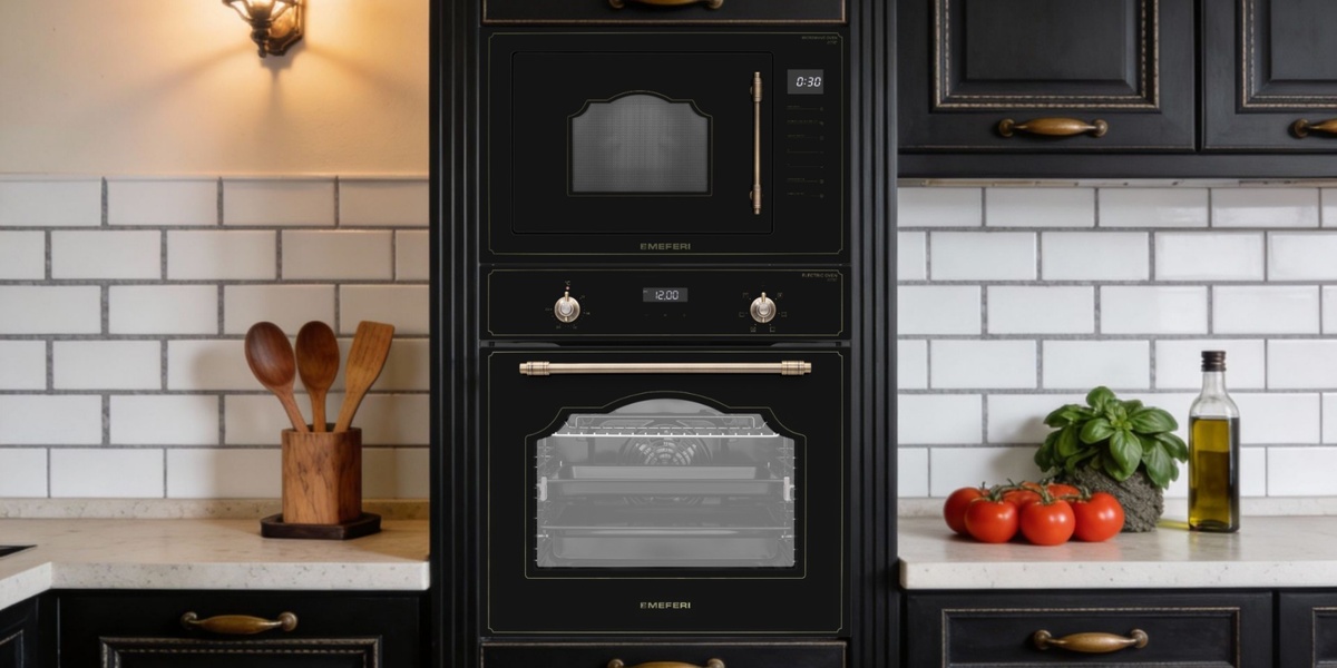 Новая линейка MEFERI RETRO — это современная техника, созданная по правилам золотой эпохи кухонного дизайна, в духе трендового Smeg. Элегантные встраиваемые комплекты духовых шкафов и микроволновых печей в бежевом и чёрном цветах позволяют выдержать кухню в едином стиле, сохраняя высокую технологичность. В бежевом варианте ретро‑линия добавляет интерьеру мягкого теплого света и ассоциаций с европейскими кофейнями середины прошлого века. Такой комплект идеально подходит для светлых неоклассических кухонь, создавая ощущение домашнего уюта и спокойствия. Чёрный комплект RETRO стал акцентом для более смелых пространств — от глубоких тёмных фасадов до минималистичных монохромных решений. Контрастная техника с фирменными металлическими ручками и аналоговыми мотивами подчёркивает статус интерьера и идеально вписывается в тренд на total black и тёмные кухни. Фирменный акцент линейки — выразительные ручки: они напоминают винтажную фурнитуру и создают ощущение настоящего «семейного» прибора, кот