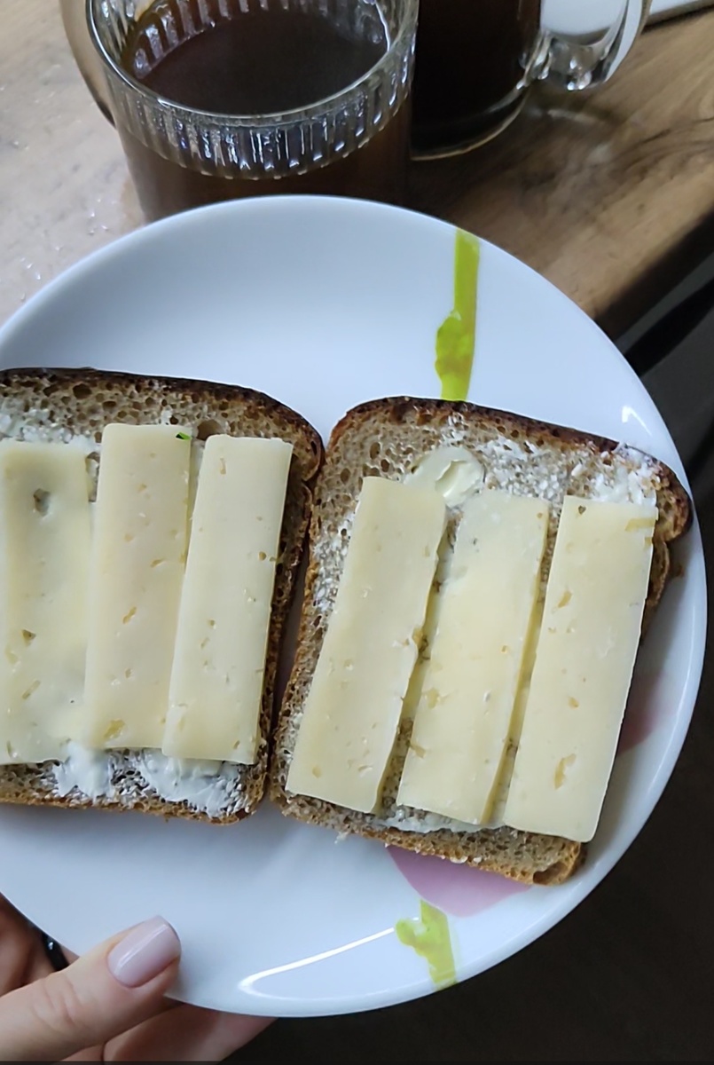 На первый перекус омлет из яиц, молока, батон с творожным сыром