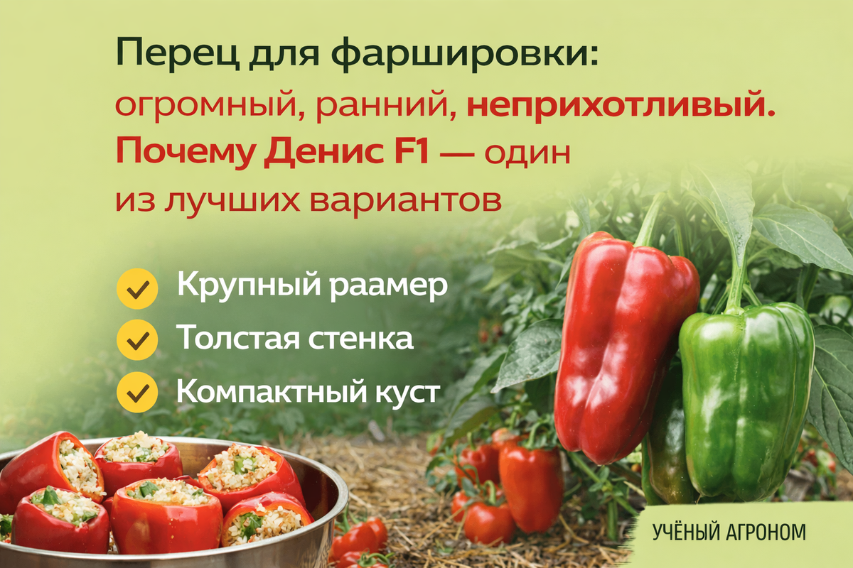 Для фаршировки нужен не просто «крупноплодный» гибрид, а перец с конкретными свойствами. И именно поэтому Денис F1 уже несколько лет стабильно входит в список самых удачных вариантов для теплиц и холодных регионов.
