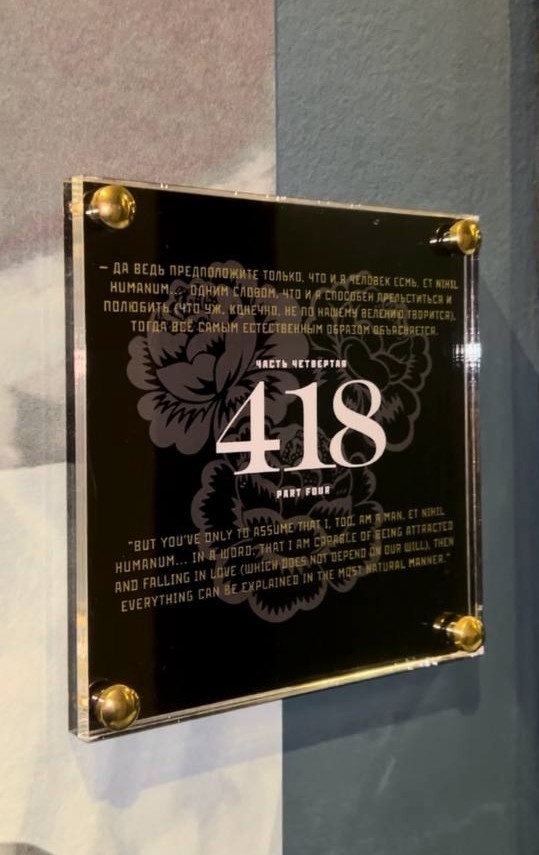 Спешим напомнить, что в отеле Radisson Соня, Санкт-Петербург, каждая комната – это возможность вступить в диалог с великим Достоевским. У номера 418, как и у всех остальных, вы найдете цитату из «Преступления и наказания»: «Да ведь предположите только, что и я человек есмь, et nihil humanum... одним словом, что и я способен прельститься и полюбить...» (Ч. IV, предл. 18) Эта мысль напоминает нам о всеобщей потребности в любви и противоречивости человеческой натуры. Позвольте и себе задуматься о великом, наслаждаясь атмосферой нашего отеля🩵