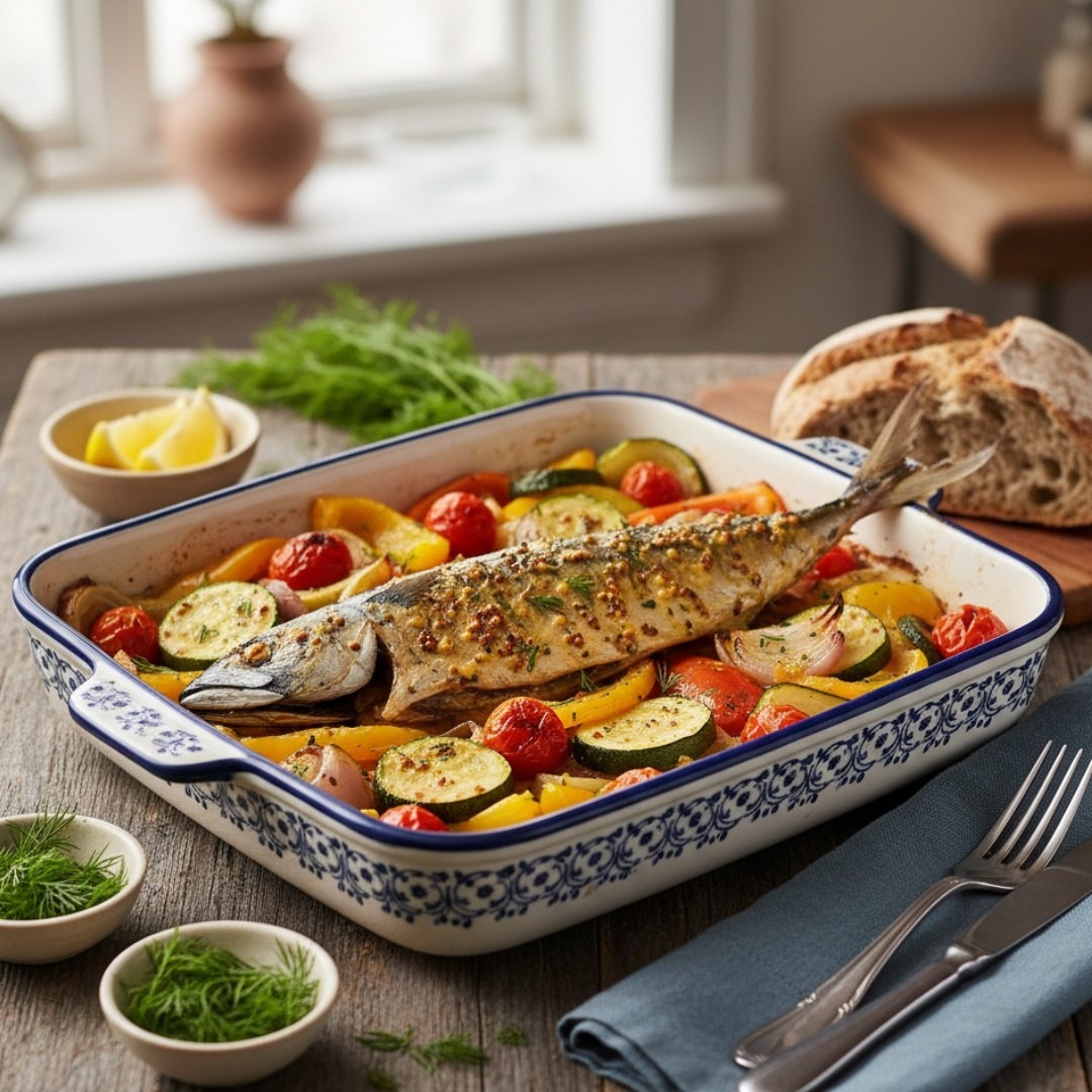Ингредиенты⤵️ 🔸Скумбрия свежемороженая — 2 шт. 🔸Лимон — 1 шт. 🔸Лук репчатый — 2 шт. 🔸Помидор — 2 шт. 🔸Сметана — 100 г 🔸Горчица дижонская — 1 ст.л. 🔸Укроп — 1 пучок 🔸Соль, чёрный перец, паприка —1 щепотка 🔸Масло растительное — 2 ст. л. Приготовление🐟 1. Духовку разогреть до 180°C. Противень застелить фольгой, смазать маслом. 2. Скумбрию разморозить, выпотрошить, удалить жабры, промыть и обсушить. Надрезать тушки с одной стороны диагональными надрезами. 3. Натереть рыбу внутри и снаружи солью, перцем и паприкой. Внутрь каждой поместить по 2-3 дольки лимона и веточке укропа. 4. Лук нарезать кольцами, помидоры — кружками. 5. Выложить на противень «подушку» из лука и помидоров. Сверху разместить рыбу. 6. Смешать сметану с горчицей и половиной измельчённого укропа. Смазать рыбу соусом. 7. Запекать 30–35 минут до золотистой корочки. За 10 минут до конца можно полить выделившимся соком. Рецепт дня #запеченная_скумбрия #рыба #овощи #маринад #горчица