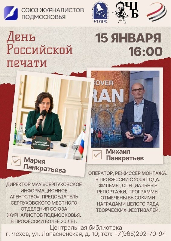 👉Мария – директор медиа агентства из Серпухова, автор документальных фильмов. Михаил – опытный оператор и режиссер монтажа их совместного творческого дуэта. 🔆На мероприятии гости смогут узнать секреты создания документального кино, услышать интересные профессиональные истории, обсудить вопросы журналистики и роли СМИ сегодня. 🚫 Возраст: 12+ 📆 15.01.2026 🕛 16:00 🏢 Центральная библиотека 📍 г. Чехов, ул. Лопасненская, д.10 🪙 Вход свободный❗️ ⭐Поддержать канал голосом ✅ Мероприятия Чехов https://dzen.ru/id/66cc4b48e9ef144699238a51 http://vk.com/chekhov_events http://dzen.ru/chekhov_events