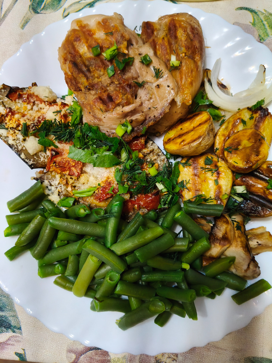 Во-вторых. Некоторые, не будем показывать пальцем, сказали, что хотят курицы и овощей запеченых на гриле. А курица из чугунка им больше не по душе.