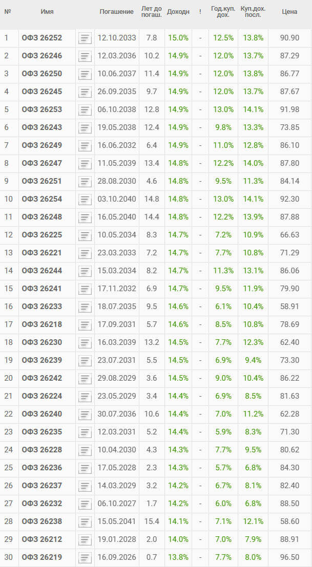 Вот так сейчас выглядит ТОП-30 ОФЗ по доходности. Несмотря на продолжающееся снижение ставки и подтверждение планов ЦБ по дальнейшему снижение - доходности выглядят вполне достойно. НО, при принятии решения о покупке НА ОСНОВАНИИ %% ДОХОДА рекомендую смотреть на столбец - Куп дох посл. Вы спросите - Почему не на Доходн (то есть Доходность)? Ответ простой - Доходн - это ставка подразумевающая, что все полученные купоны будут реинвестироваться по той же ставке. Ответ сложной - Доходн - это теоретическая ставка YTM рассчитанная через дисконтирование во времени денежных потоков от облигации. Это достаточно важная информация, потому что в любой облигационной подборке Вам скорее всего будут показывать именно Доходность и по ней сравнивать облигации. Сейчас покажу яркий пример, почему нельзя принимать инвест решения о покупке облигации только по показателю доходности если вы хотите получать %% доход прямо сейчас. Смотрим на табличку. Например строка 19: - Доходность -14,5% - Год куп дох - 6,9