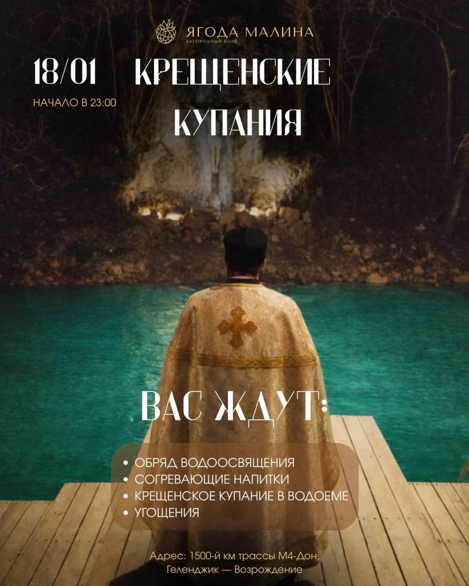 Дорогие гости, ждем вас в Крещенскую ночь с 18 на 19 января Начало в 23:00 Вас ждут: • Обряд водоосвящения • Согревающие напитки • Купание в водоеме • Угощения Приезжайте к нам за любимыми традициями и оздоровлением Подробнее по телефону: +7 (928) 435-00-05