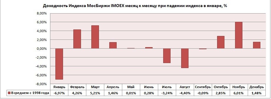 ? 🌟 📈 Анализируем динамику Индекса Мосбиржи (IMOEX) и делимся интересными наблюдениями! Согласно статистике с 1998 года, выявлена любопытная закономерность: • Если индекс Мосбиржи снижается в январе, то в феврале и марте обычно наблюдается рост акций — в среднем почти на 10% за два месяца! • Если же в январе индекс растёт, то в феврале–марте рост продолжается, но менее активно — в среднем на 5,5% за два месяца. 💡 Что это значит для инвесторов? Эта закономерность может стать поводом рассмотреть стратегию покупки акций в конце января с удержанием позиций в феврале и марте. Однако важно помнить: ключевое условие успеха — это выбор «сильных» акций с устойчивым потенциалом роста! 📊 На графиках вы видите месячную динамику доходности IMOEX при падении и росте индекса в январе. 🚀 Вывод: начало 2026 года может принести интересные возможности для инвесторов, умеющих анализировать тенденции и выбирать перспективные активы. Следите за рынком и принимайте обоснованные решения!