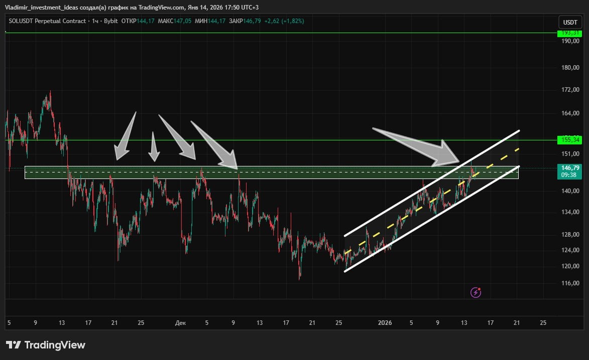 #SOL находится цена у сопротивления, от сюда цена может отскочить. При пробое и закрепе выше уровня, то будет лонг, цели показал. Если цена пробьет коридор вниз можно рассматривать шорт, цель для шорта 133$ минимум