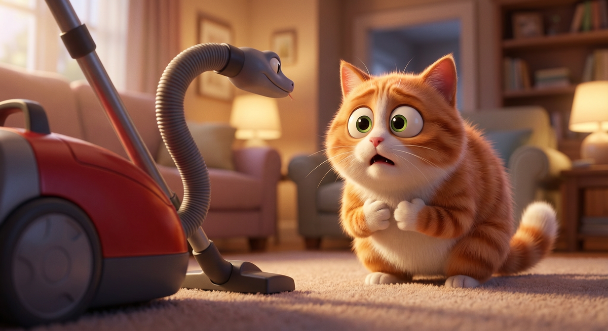 Начнем с классики. Пылесос. Для вас - бытовой прибор, помощник в уборке. Для кота - огромное рычащее чудовище, которое движется непредсказуемо, громко ревет и пытается всех сожрать.
