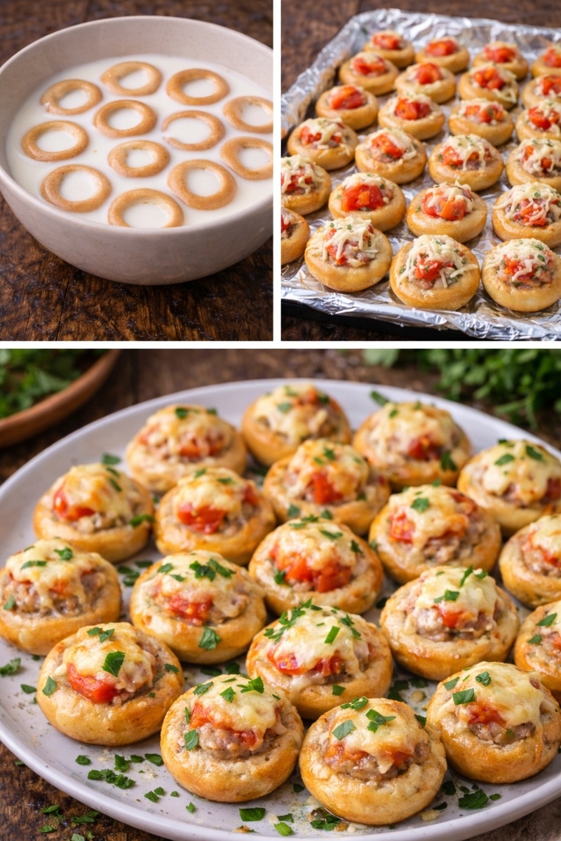 4⃣ Сформируйте из фарша небольшие шарики и поместите их внутрь отверстий бубликов. По желанию добавьте в фарш чеснок, лук или специи.
