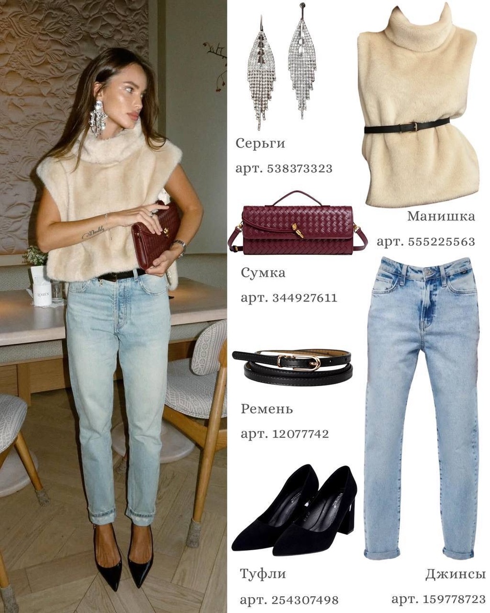 Этот образ — идеальная база для повседневной зимы. В его основе — светлая манишка с мягкой текстурой, прямые или слегка зауженные джинсы и аккуратная обувь на устойчивом каблуке или плоской подошве. Он выглядит расслабленно, но при этом очень собранно за счет правильных пропорций.