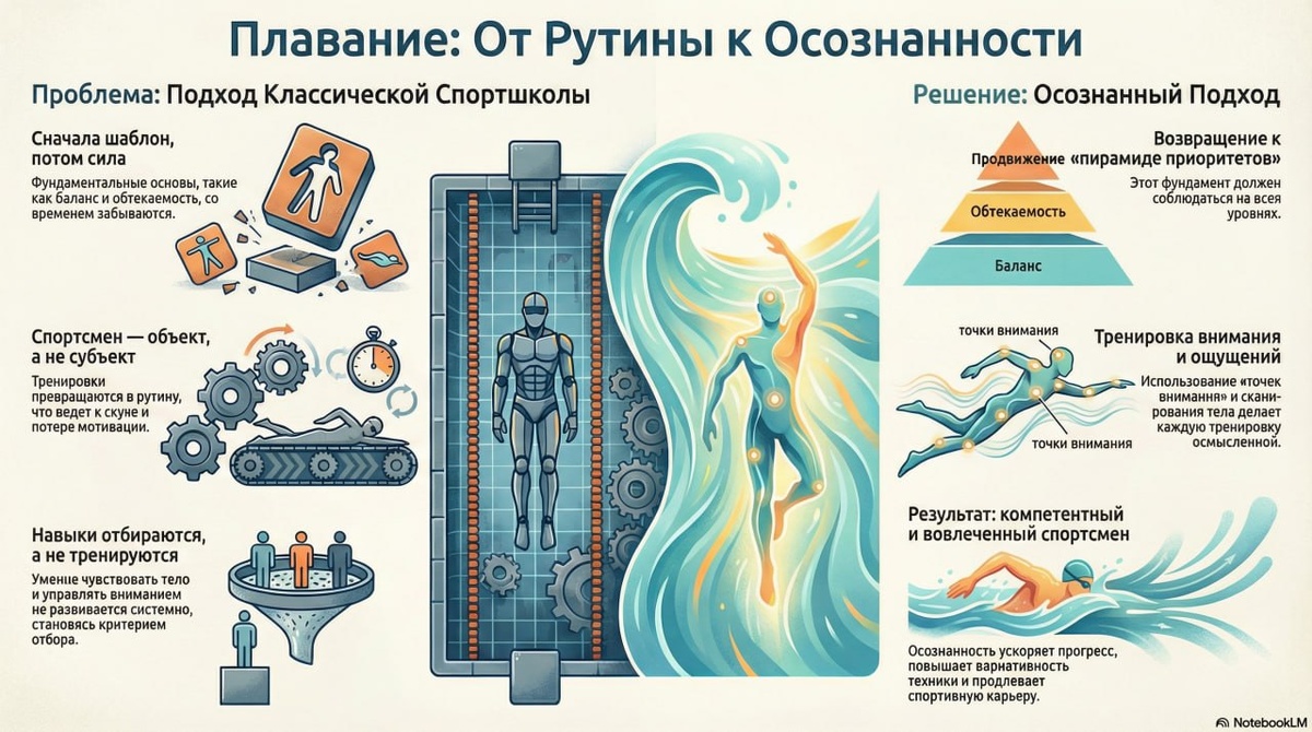 ? Методика «Полное погружение» направлена на то, чтобы сделать плавание таким же простым и естественным процессом, как обычная прогулка пешком. Основная цель - не преодоление сопротивления воды силой, а достижение гармонии с ней для максимальной энергоэффективности. Вот основные принципы методики для достижения максимальной эффективности и экономии энергии: • Осознанность и тренировка мозга. Плавание рассматривается не просто как физкультура, а как интеллектуальная практика, подобная йоге или тай-цзы. Основное внимание уделяется тренировке мозга, а не мышц, здесь каждое движение должно быть осознанным. Настоящий прогресс достигается через «умные» тренировки и анализ техники, а не через изматывающие заплывы на силу и выносливость. • Баланс и использование плавучести. Вместо того чтобы тратить силы на удержание тела на поверхности («борьбу с водой»), пловец учится использовать выталкивающую силу. Важно перестать искать в воде твердую опору, как мы привыкли на суше, и почувствовать, к