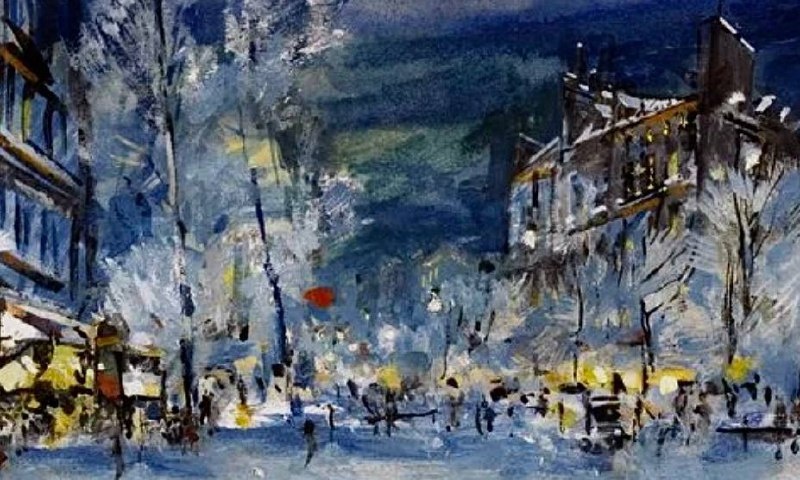 С 1923 года Константин Коровин живёт в Париже. Он много пишет городских сцен — во многом «на продажу», но при этом не теряет главного: поэтичности и свободы мазка. В этих работах чувствуется лёгкая грусть. Париж у Коровина — не конкретное место, а ощущение: город-состояние размытые фасады фонари — как тёплые пятна света фигуры — почти тени Холодная сине-зелёная гамма смягчается жёлтыми, охристыми, тёпло-белыми вспышками. Снег растворяется в воздухе. Как и во многих поздних его работах главный герой — свет: свет фонарей отражения на мокром снегу тихое сияние витрин. Константин Коровин. «Зимний Париж». Ок. 1925 г