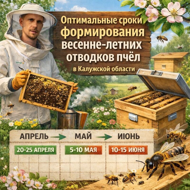 Цель: Увеличение пасеки и одновременная замена старых маток посредством формирования отводков методом деления сильной многокорпусной семьи пополам с выводом собственной матки (свищевой). Формирование отводков должно производиться до начала главного медосбора, чтобы новые семьи успели окрепнуть. Ниже приведены рекомендации с учётом климатических условий Калужской области, фенологии медоносов, биологии вывода маток и графика главного взятка.