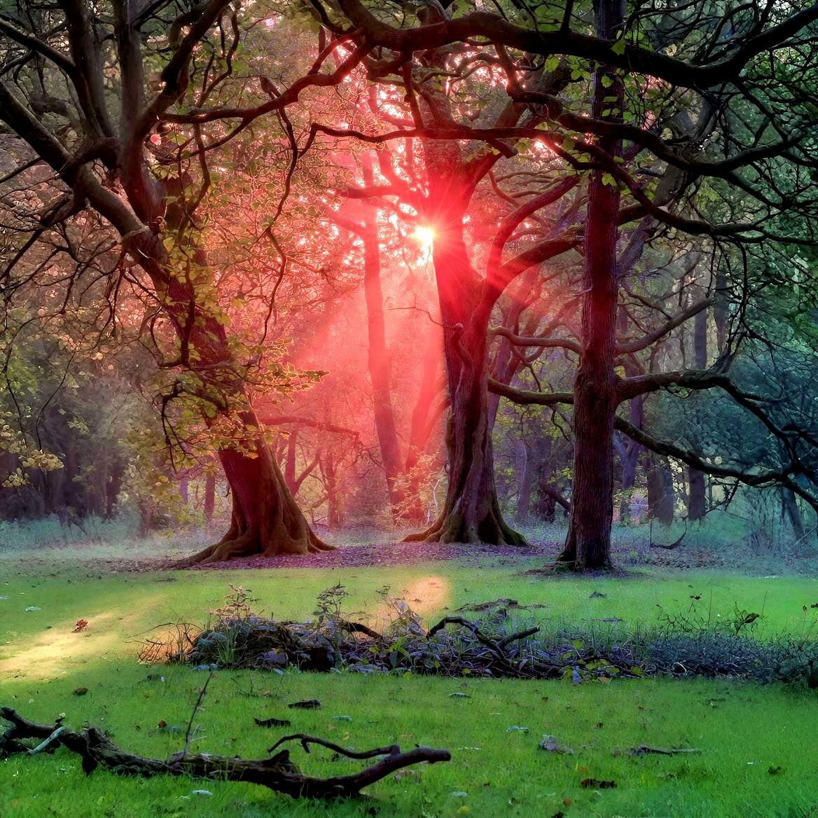 Солнце склонялось к закату за одной из поросших густой травой полян в лесу. Вековые дубы с низкими стволами и раскидистыми ветвями, возможно, помнившие ещё римские легионы, простирали свои узловатые ветви над мягким ковром зелёной травы. Кое-где к дубам примешивались буки, остролисты и кустарники, образуя густые заросли, не пропускающие лучи заходящего солнца. В других местах деревья расступались, образуя длинные аллеи, уходящие вглубь леса. Красные лучи заходящего солнца проникали сквозь листву, создавая игру света и тени на стволах деревьев и поляне.