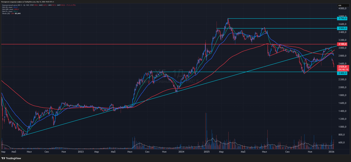 Акции X5 на январских праздниках упали на 10% на дивидендном гэпе. Напомню, компания заплатит 368 руб. на акцию при прогнозе 300 руб. После этого снижение котировок продолжилось: те, кто пробовал откупать, получили ещё движение вниз примерно на 8%. Есть несколько причин, о которых участники закрытого клуба знали заранее, поэтому закрыли позицию перед дивидендной отсечкой. Во-первых, X5 сообщала, что изучает возможности монетизации казначейского пакета в размере 9,7%, который появился после редомициляции. В отличие, например, от Лукойла, компания не планирует его гасить. Это значит, что пакет могут либо продать в рынок, либо реализовать стратегическому инвестору с дисконтом. В любом случае это оказывает давление на котировки. Во-вторых, ранее X5 заявляла, что не рассчитывает вернуться к рентабельности 7–7,5% в долгосрочной перспективе из-за роста НДС и инфляционных издержек. Это негативный сигнал, учитывая, что рентабельность снижается уже пятый год подряд. Таким образом, я не вижу смыс