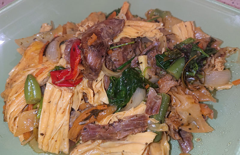 ✔ Филе утки (грудка без кожи) — 200 г; ✔ Спаржа соевая (фучжу, сухая) — 30 г; ✔ Лук— 1 шт.; ✔ Морковь — 1 шт.; ✔ Перец болгарский — 0,5 шт.; ✔ Фасоль стручковая (свежая или замороженная) — 80 г; ✔ Шпинат — 30 г; ✔ Зелень (укроп, петрушка) — 15 г; ✔ Масло растительное — 1 ст. л.; ✔ Приправа карри — 1-2 ч. л.; ✔ Соль — по вкусу. Утиное филе без кожи приготовить на пару, в духовке или на очень слабом огне на сковороде без добавления масла до готовности. Дать остыть и нарезать на порционные куски. Соевую спаржу (фучжу) залить холодной водой и оставить замачиваться на 30-60 минут до размягчения. Затем тщательно отжать от жидкости. В сковороде или сотейнике разогреть масло. Обжарить нарезанный полукольцами лук до прозрачности. Добавить нарезанную соломкой морковь и готовить 3-4 минуты. Добавить нарезанный кубиком болгарский перец и стручковую фасоль, обжаривать всё вместе ещё 5-7 минут. К готовым овощам добавить нарезанную утку, сверху выложить отжатую соевую спаржу. Влить немного воды (50-
