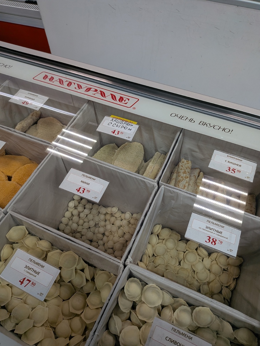Что-то в последнее время все мои визиты в "Ермолино" приводили к тому, что я узнавала не о новинках, а о том, что некоторые продукты, наоборот, перестали продаваться: моя любимая пицца с курицей пропала из ассортимента, эклеры до нашего города так и не доехали снова, когда-то мне нравилась нарезка сырокопченой колбасы, ее тоже давно уже не наблюдаю. Из новинок помню только овощные галеты, что привезли больше месяца назад, хотя при этом регулярно попадаются анонсы их новой продукции. Как я поняла (хоть и не уверена, что все именно так), если новинка и появляется, то некоторое время она продается только в Москве, а уже потом решается - оставлять ли ее и отправлять в другие города или же и вовсе убрать. Тем не менее, одна из новинок все же приехала, увидела ее случайно, сразу решила, что будем покупать и дегустировать, а заодно и другие продукты возьмем: Шикарный написанный от руки ценник говорит нам о том, что можно приобрести хашбрауны с сыром за 435 рублей/кг. Дороже котлет и пельмен