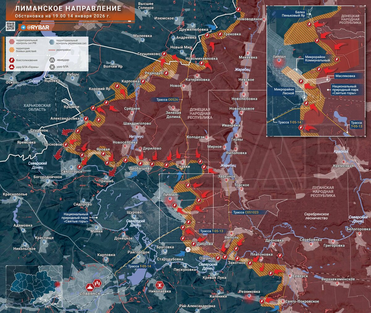 🔸Части ГВ «Запад» постепенно выходят к северному рубежу обороны Славянска. Параллельно с продвижением к Святогорску российские войска расширяют зону контроля и в окрестностях самого Лимана. 🔸Штурмовые группы при поддержке дронов постепенно изолируют укрепления противника на подступах к городу, формируя предпосылки для будущего штурма. 🔻Что происходит на направлении? ▪️После занятия балки Пеньковый Яр штурмовики ГВ «Запад» ведут атаки в сторону расположенного рядом крупного опорного пункта. Его взятие необходимо для установления огневого контроля над маршрутами снабжения противника в районе Ставок. Также обеспечит штурмовым группам укрытия для накапливания и дальнейшего продвижения к Лиману с севера. Более того, уже появились сообщения о начале боев на окраинах города, однако подтвердить их пока не представляется возможным. ▪️Восточнее российские подразделения сжимают полуокружение вокруг позиций ВСУ у трассы Лиман — Заречное. Учитывая сложившуюся конфигурацию фронта и эффективную ра