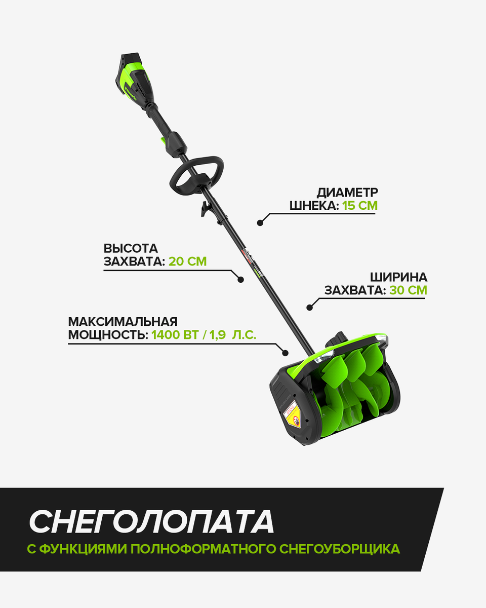 Аккумуляторный снегоуборщик Greenworks GD40SS2 (2603107), 40V, 30 см — ваш незаменимый помощник в зимних заботах. Этот снегоуборщик станет отличным зимним дополнением к вашей коллекции устройств для сада 40V. Он идеально подходит для владельцев дач, частных домов и отдельно стоящих гаражей, позволяя легко чистить не только открытые площадки, но и террасы и патио. Прочный пластиковый шнек не повреждает декоративное покрытие, очищая снег до основания. 👀Инновационный бесщёточный двигатель DigiPro™ с электронным управлением обеспечивает высокий крутящий момент, эффективный расход энергии и долгий срок службы без обслуживания. Мощный двигатель позволяет легко справляться со свежим и слежавшимся снегом. ❄️Регулируемое направление выброса снега можно настроить на 30° вправо и влево от оси устройства, что удобно при расчистке длинных и узких площадок, например, занесенных снегом садовых дорожек. Дальность выброса снега достигает до 7,6 метров. 💡Две яркие LED-фары на ковше устройства подсвеч