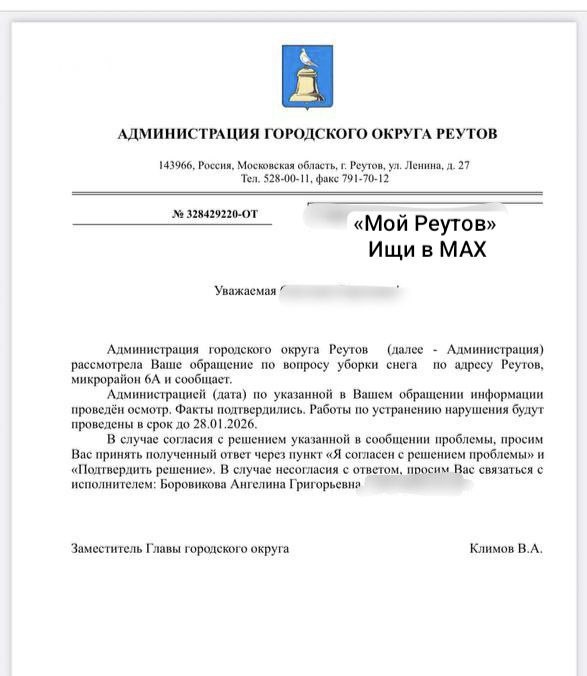 "Вот такой ответ от Администрации города пришёл жителям микрорайона 6"А" по уборке снега. 2 недели на уборку снега!!!!!! А ничего, что на улице зима и снег ещё будет идти не один день до 28.01. А 2 недели людям как передвигаться? Как сходить в магазин, как добираться до общественного транспорта? Или всем дома сидеть?" #отподписчиков 📲 «Мой Реутов» в MAX