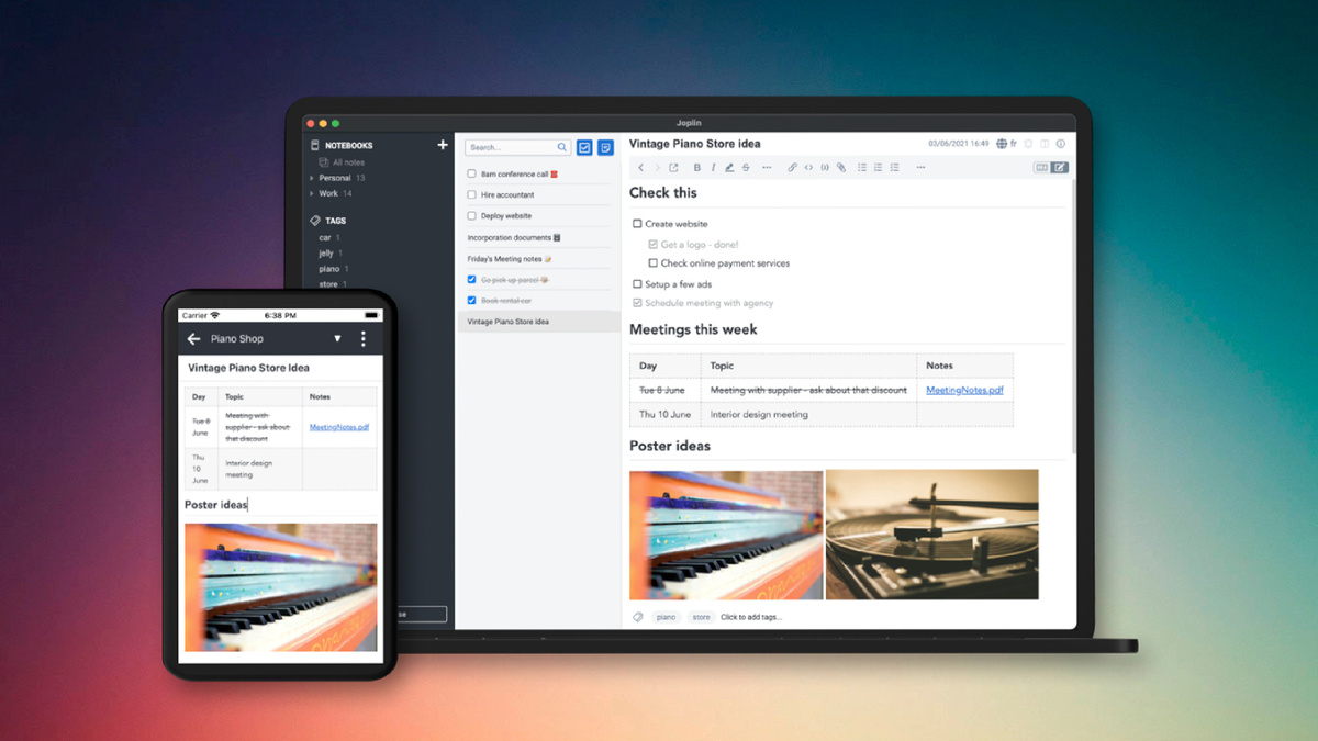 Joplin - это бесплатное приложение для заметок и задач с открытым кодом. Оно хранит ваши записи в формате Markdown и синхронизирует их между компьютером, телефоном и терминалом. Заметки легко искать, тегировать и редактировать. Интерфейс делится на три части: боковую панель с блокнотами и тегами, центральный список заметок и редактор. Вы можете писать как в визуальном редакторе, так и прямо в Markdown, используя простой синтаксис для форматирования текста, списков или ссылок. Заметки упорядочиваются в древовидную структуру блокнотов, а для гибкости используются теги. Вы можете импортировать данные из Evernote и других сервисов. Синхронизация работает через Joplin Cloud, Dropbox, Nextcloud или WebDAV, с опциональным сквозным шифрованием для полной конфиденциальности. Браузерное расширение Web Clipper сохраняет статьи и скриншоты. Система плагинов добавляет новые функции, например, вкладки или оглавление. К заметкам можно прикреплять файлы, а поиск поддерживает сложные запросы. Приложени