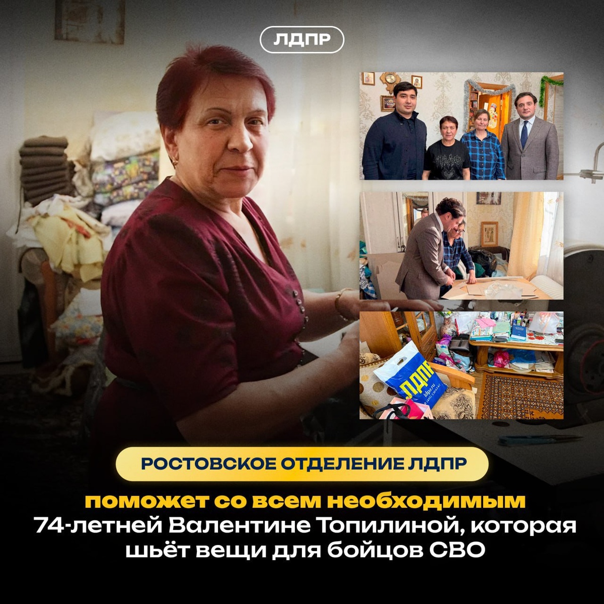 ✨✨✨ По поручению Председателя ЛДПР Леонида Слуцкого представители Ростовского регионального отделения ЛДПР посетили 74-летнюю жительницу Новочеркасска Валентину Топилину — волонтёра, которая с первых дней специальной военной операции помогает бойцам на передовой. ✅ Когда её сын ушёл защищать Родину, Валентина Топилина не осталась в стороне — села за швейную машинку и начала шить вещи для фронта. Ранее она много лет работала социальным работником и помогала людям, оказавшимся в трудной жизненной ситуации. ✅ Сегодня вместе с прихожанами местного храма и сёстрами милосердия Валентина шьёт балаклавы, рубашки, шапочки под каски, подушки и другие необходимые вещи. С 2022 года волонтёрский кружок отправил военнослужащим более тысячи изделий. Сейчас команда Валентины Топилиной работает над пошивом 50 комплектов тёплых пижам для бойцов. ЛДПР обеспечит волонтёров материалами, поможет с логистикой и окажет регулярную поддержку. Уже 19 января очередная партия гуманитарного груза будет направле
