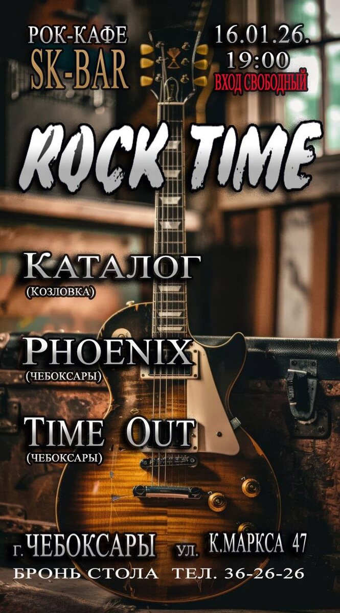 ! 🎸 16 января на сцене рок-кафе «SK bar» пройдет фестиваль «ROCK TIME»! Это событие, которое нельзя пропустить! На одной сцене выступят три невероятные рок-группы: 🔥 Группа "КАТАЛОГ": В этом году они отмечают 35 лет с момента своего основания! Эти мастера играют мировые хиты таких легенд, как Deep Purple, Led Zeppelin и Aerosmith. Не упустите шанс услышать их исполнение классики, включая "Shine on you crazy diamond" от Pink Floyd, с которой они выступали на открытии «Арбата» в 1991 году в Чебоксарах! читаем—-»» "Последние из Могикан" ⏳ Группа "Time Out": С юбилеем в 10 лет в нынешнем составе! В феврале они готовят большой концерт в ДК Ухсая. "Time Out" радует поклонников популярными хитами русского рока и является постоянным участником музыкальных фестивалей. 🔥 Группа "PHOENIX": Легенды рок-н-ролла Чувашии под руководством Сафронова Александра, патриарха чебоксарского рока! Их репертуар включает хиты 60-х, 70-х и 80-х годов на разных языках народов мира. 📅 Когда: 16 января 🕕