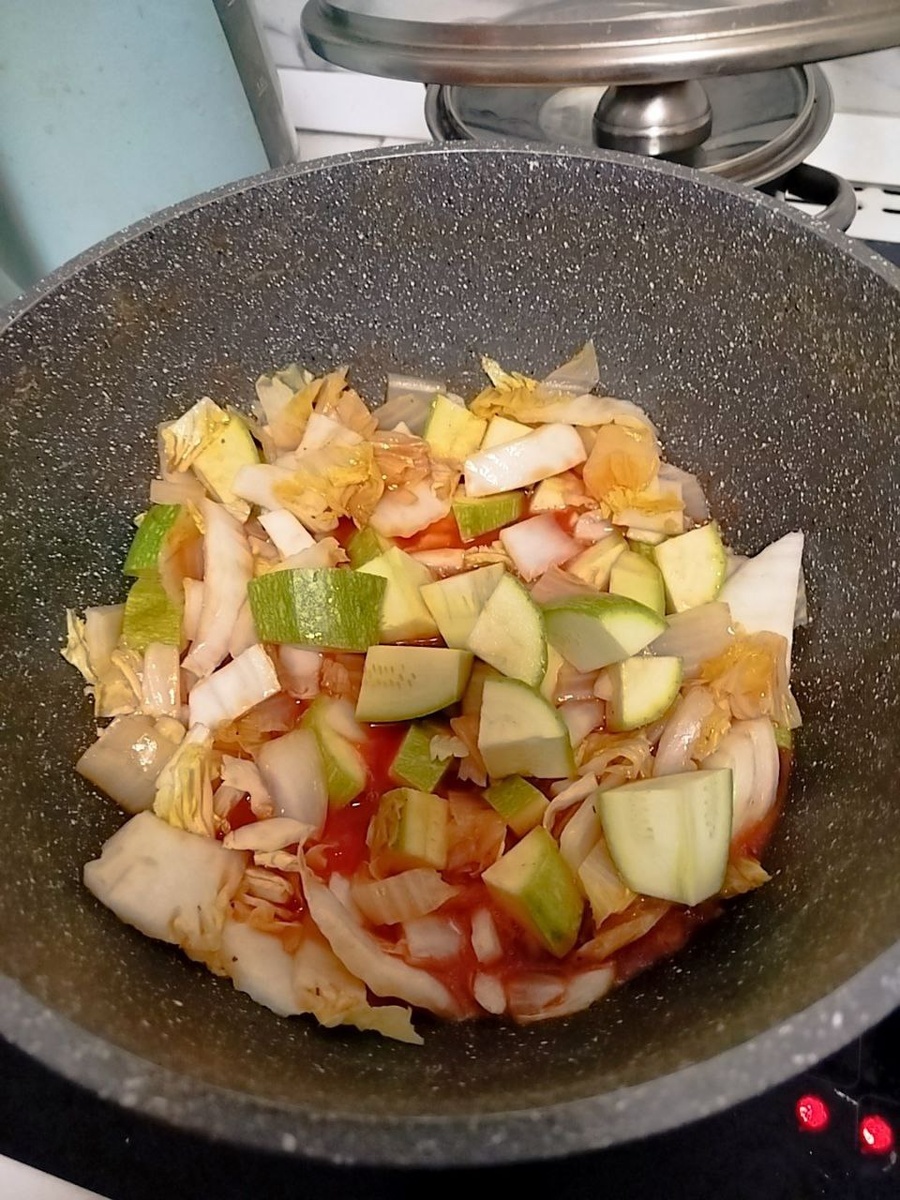 Тушу на ужин пекинскую капусту и кабачки в томатном соке 😋