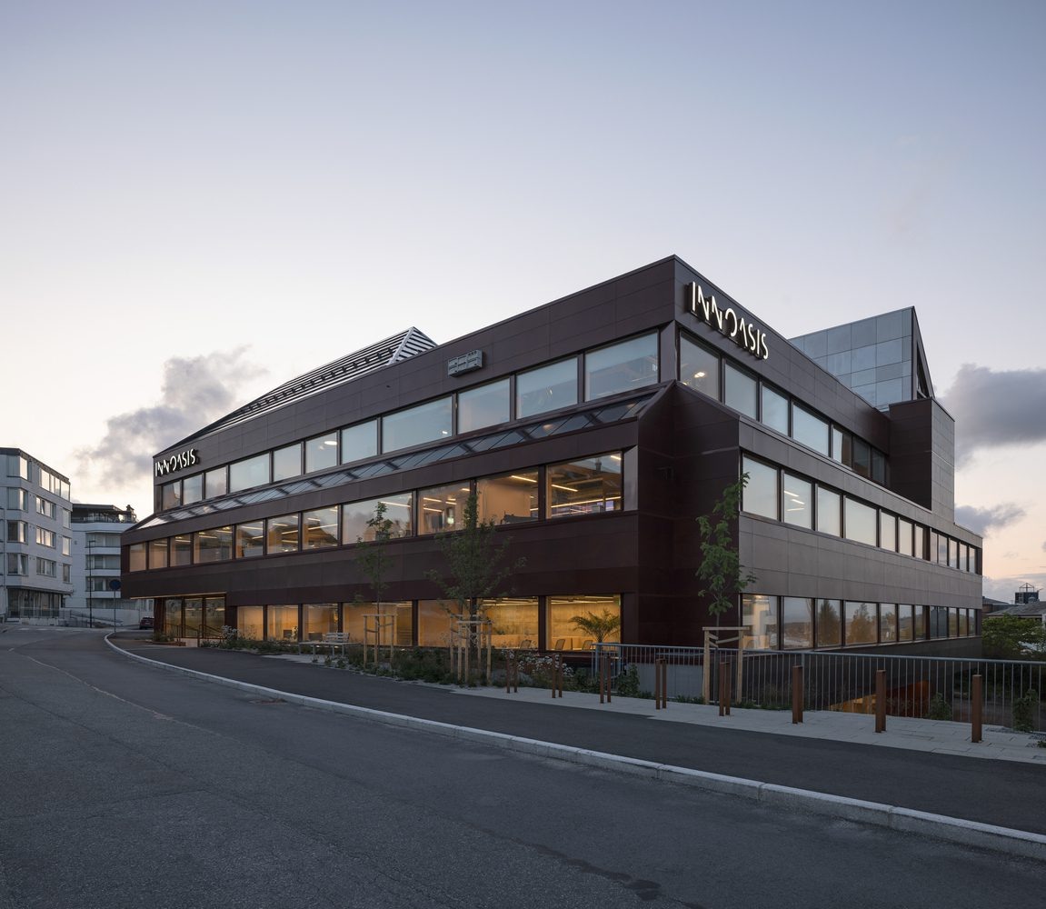 В городе Ставангер завершена трансформация офисного здания 1978 года постройки. Проект примечатален тем, что наглядно демонстрирует преемственность материалов из разных эпох. Архитектурное бюро Helen & Hard превратило бетонную "коробку" в современное рабочее пространство, сделав дерево главным инструментом архитектурных изменений. Несущая система из бетонных колонн и перекрытий сохранена и оставлена видимой. Контраст между существующим бетоном и новой деревянной архитектурой стал важной частью образа. Бывший внутренний двор преобразован в крытый атриум. В него встроены галереи для движения, места для встреч и зоны отдыха. Деревянные колонны из необработанных стволов ели воспринимаются как лес и задают визуал, отличающийся от классической офисной архитектуры. Дерево активно используется и в акустике: рейки между бетонными ребрами и натуральные материалы в отделке улучшают звукопоглощение и формируют комфортную среду для работы. Организация рабочих пространств построена по принципу