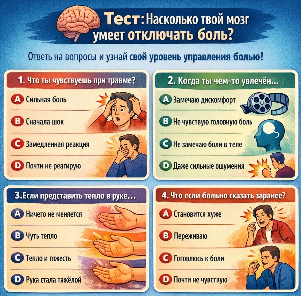 Иногда люди переносят сильную боль так, будто её вообще нет. Это не магия — это работа мозга. Посмотри на картинку с вопросами выше 👆