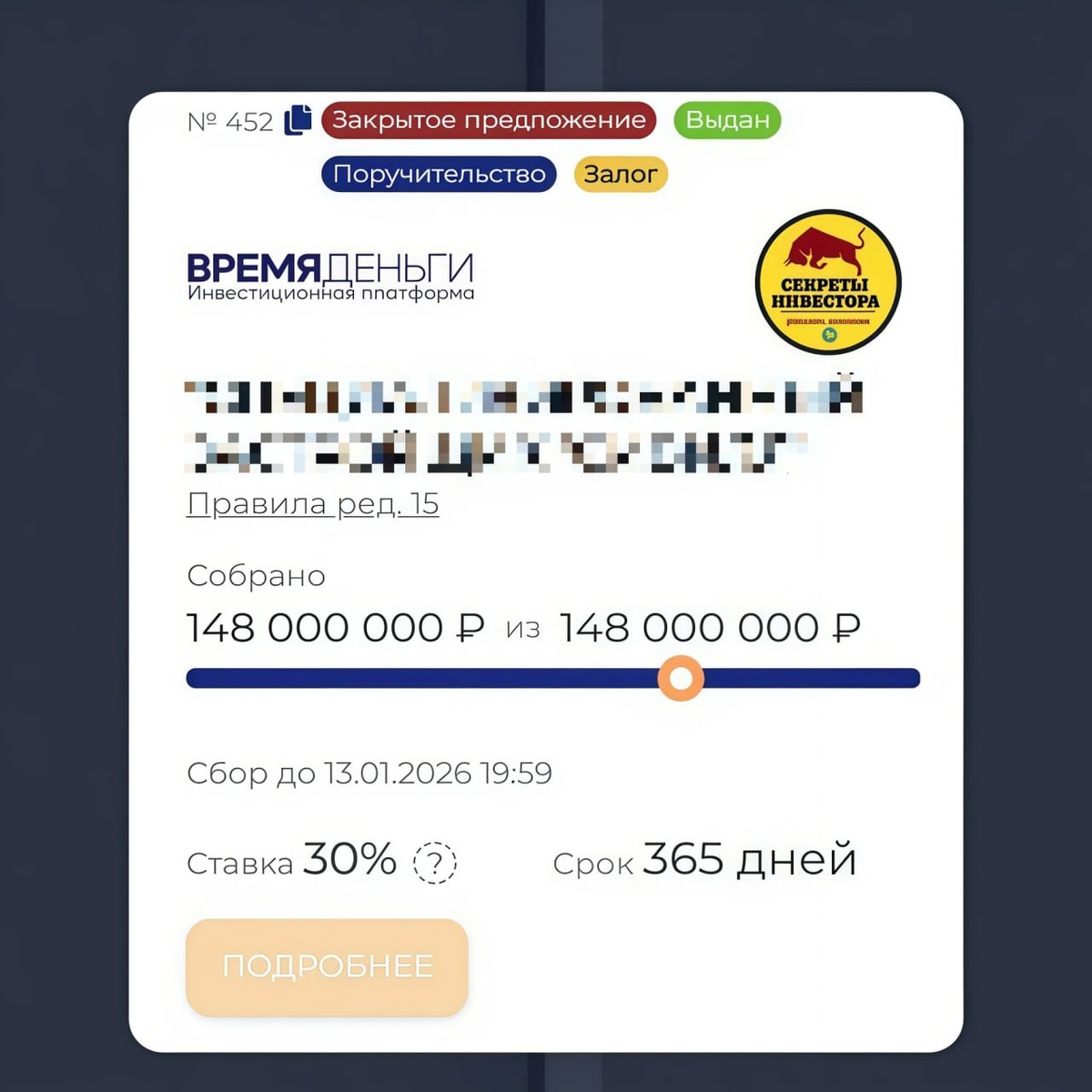 👍 Официально, 2026 стартовал, с чем Вас и поздравляю ➕ Первая сделку в 2026, инвесторы закрыли сбор вчера Общая сумма сделки - 148 000 000 рублей Разделили ее с нашим партнером, проинвестировав 78 000 000 рублей из общей суммы сбора Сделку провели на Инвестиционной Платформе Время Деньги В своём официальном канале Платформа рассказала про совместную сделку ✅ Платформа ВРЕМЯ ДЕНЬГИ (состоит в Реестре ОИП ЦБ РФ) ‼️‼️‼️ Все сделки по выдаче займов бизнесу под залог недвижимости с фиксированной выплатой процентов, сообщество инвесторов Синдикат структурирует и проводит в соответствии с 259-ФЗ, на Инвестиционных платформах (Реестр ОИП Банка России) Для инвесторов и заемщика, это законный, простой и безопасный способ проводить сделки под надзором регулятора, в строгом соответствии с законодательством РФ. Наша вторая, но точно не последняя, сделка с Платформой Андрея Пушкарева 🤝 ВремяДеньги (на сайте Банка России): ➡️https://cbr.ru/finorg/foinfo/?ogrn=1197232030214 Партнерство