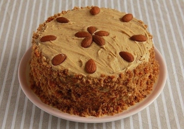 4. Приготовить крем. Растворить кофе в кипятке. Размягченное масло взбить с сахарной пудрой и кофе. Смазать кремом нижний корж, накрыть вторым пластом теста, смазать верх и бока торта. Украсить миндалем и крошками, поставить в холодильник на несколько часов перед подачей.