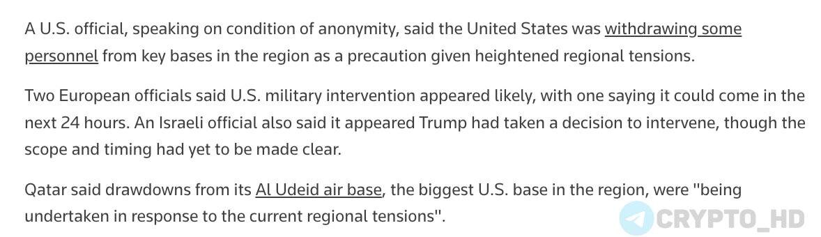 ➥ Два европейских чиновника заявили Reuters, что военное вмешательство США представляется вероятным, один из них сказал, что оно может произойти в течение следующих 24 часов. ➥ Представитель Израиля также заявил журналистам, что, по всей видимости, Трамп уже принял решение о вмешательстве, хотя масштабы и сроки еще не были уточнены. ➥ США отзывают часть персонала с ключевых баз в регионе в качестве меры предосторожности в связи с обострением. ➥ Катар заявил, что сокращение численности авиабазы Аль-Удейд, крупнейшей американской базы в регионе, «осуществляется в ответ на нынешнюю региональную напряженность». ➥ Три дипломата заявили, что некоторым военнослужащим было приказано покинуть базу, хотя никаких непосредственных признаков массовой переброски солдат на автобусах на футбольный стадион и в торговый центр, как это произошло за несколько часов до ракетного удара Ирана в прошлом году, не наблюдалось. ➥ Иран предупреждает об ответных мерах в случае удара США. Ранее: драйвер рос