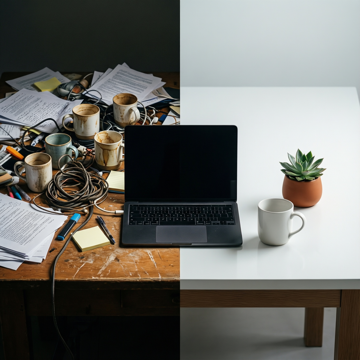 Беспорядок на столе — это не просто эстетическая проблема. Это постоянный, тихий источник когнитивной нагрузки, который крадёт вашу концентрацию и увеличивает стресс.