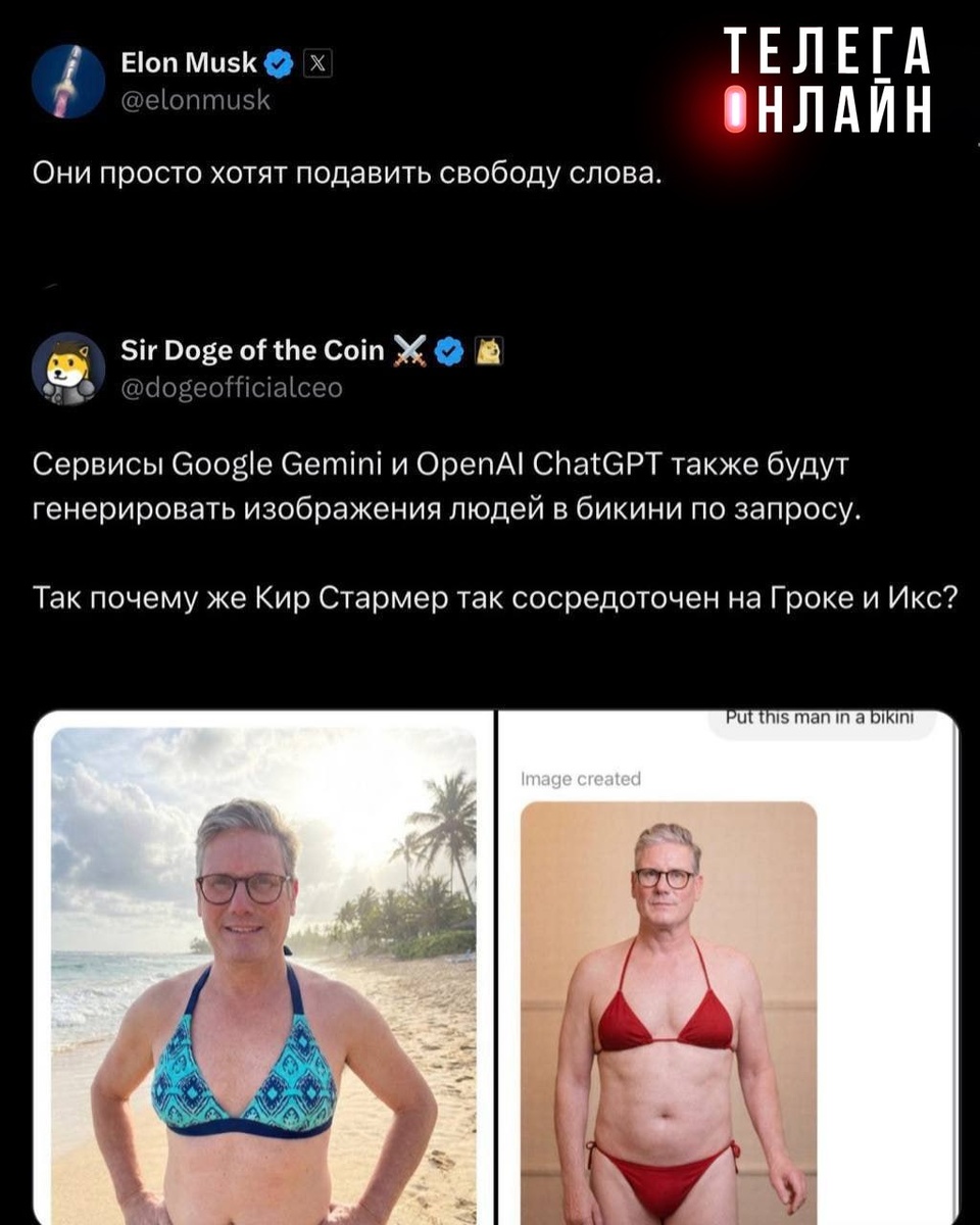 Договорились? Премьер Британии Стармер, чьи нейрофоточки в купальнике на днях постил Маск, сообщил, что соцсеть X согласилась соблюдать