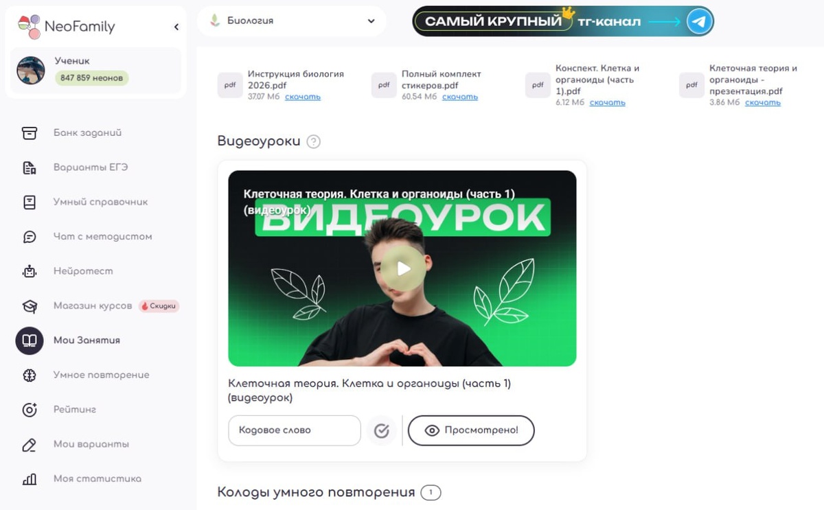 На Полугодовом курсе теперь можно проходить темы быстрее программы 🔥 Видеоуроки, конспекты и карточки уже открыты для просмотра по всем темам этого месяца! Домашки и скрипты мы тоже подгрузим перед стартом курса. Сможете закреплять все темы в ускоренном темпе Это идеально, если вы хотите пройти первые темы уже сейчас и не ждать потока На Платформу загружены все занятия вплоть до анатомии, то есть вся цитология, биохимия, метаболизм, онтогенез, генетика и т.д. ❗️ Онлайн-вебы будут проходить по нашему расписанию (пн, ср, пт 17:00 МСК). Зато видеоуроки вы можете смотреть хоть сейчас ❤️ Записывайтесь и открывайте нашу кладезь знаний по биологии: https://neofamily.ru/shop/biologiya-polugod2026 Если хотите скидку, используйте промокод ТОРТ