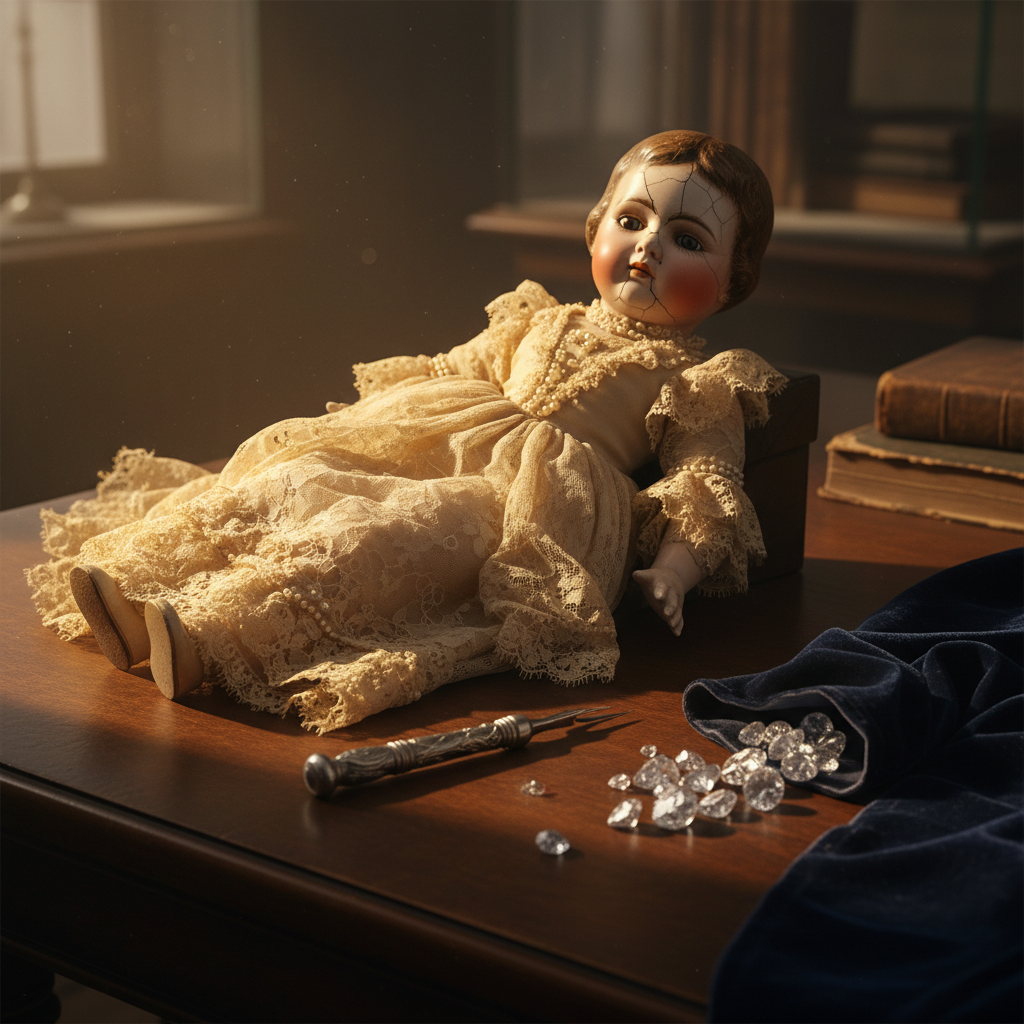 Кукла и правда была прекрасной работы, начала XX века. Лицо бледное, с лёгким румянцем, глаза из синего стекла, ресницы настоящие. Платье когда-то было роскошным, шёлк, кружево, но время его не пощадило. Я взяла её в руки, чтобы внести в реестр, и почувствовала неестественную тяжесть в области талии.