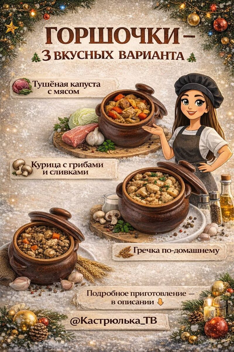 Подробные пошаговые рецепты 🥬 Тушёная капуста с мясом Ингредиенты: Капуста — 300–400 г Свинина или курица — 250 г Морковь — 1 шт. Лук — 1 шт. Томатная паста — 1 ст. л. Соль, перец — по вкусу Пошагово: Мясо нарезать небольшими кусочками. Лук мелко нарезать, морковь натереть на крупной тёрке. Капусту тонко нашинковать. В горшочек выложить слоями: мясо → лук → морковь → капуста. Добавить томатную пасту, соль и перец. Влить 50–70 мл воды. Накрыть крышкой и запекать при 180 °C ~60 минут. 🍄 Курица с грибами и сливками Ингредиенты: Куриное филе — 300 г Шампиньоны — 200 г Лук — 1 шт. Сливки 20–30% — 150 мл Соль, перец, мускатный орех — по вкусу Пошагово: Филе нарезать кубиками, грибы — пластинками. Лук мелко нарезать. В горшочек выложить курицу, затем лук и грибы. Посолить, поперчить, добавить щепоть мускатного ореха. Залить сливками. Закрыть крышкой и запекать при 180 °C 45–50 минут.