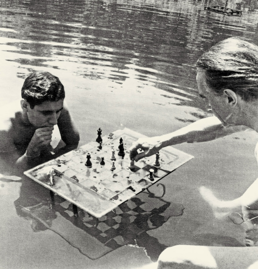 На фото: Американский шахматист, писатель и журналист Ларри Эванс играет в шахматы с Марселем Дюшаном. Фото сделано в 1958 г. Арнольдом Иглом во время съёмок его шахматного фильма «Страстное увлечение» (известным также как «Chesscetera»).