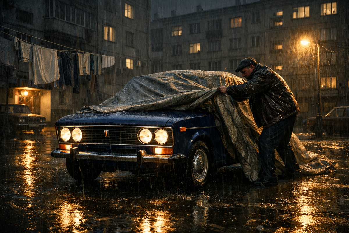 Дождь монотонно стучал по растрескавшемуся асфальту типичного московского двора конца семьдесят восьмого года. Среди рядов темнеющих окон и мокрого белья, развешанного на веревках, к парковочным местам направлялась мужская фигура. Большинство машин стояли беззащитными перед стихией — унылые, местами тронутые ржавчиной Москвичи и уставшие от жизни Копейки жались друг к другу. Но одно место отличалось от прочих. Там возвышался силуэт, бережно укрытый плотным, сшитым на заказ брезентом, туго стянутым веревками, чтобы ветер не смел трепать драгоценную ткань. Мужчина не спеша развязывал узлы, его движения напоминали священнодействие.
