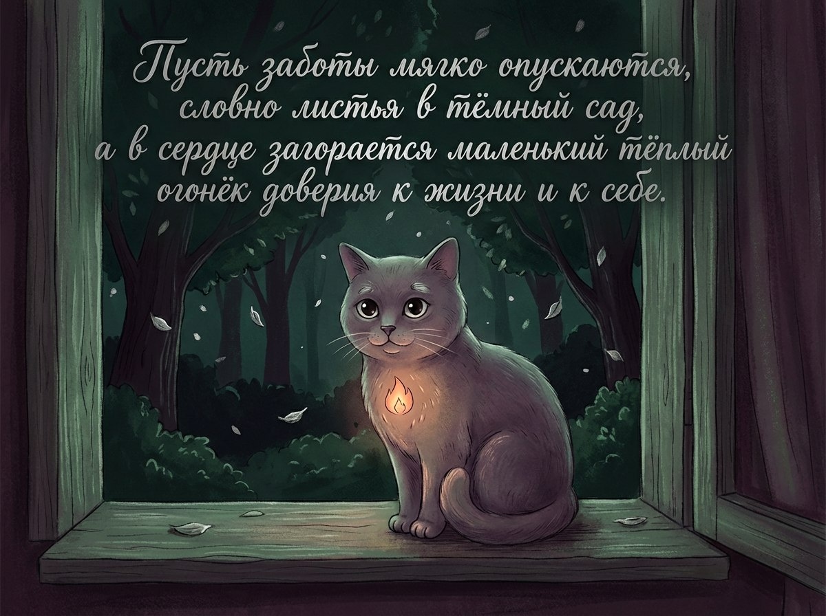 Пусть заботы мягко опускаются, словно листья в тёмный сад, а в сердце загорается маленький тёплый огонёк доверия к жизни и к себе. Вечер обнимает тебя бархатной тишиной, и каждая звезда за окном словно шепчет: «Ты сделал(а) достаточно, ты достаточно». Позволь себе расслабиться, отпустить мысли и просто быть, как я — кот, который спокойно слушает дыхание ночи и знает: мир подождёт, пока ты отдыхаешь. Пусть этот час станет твоим тихим убежищем. Представь, как невидимый мягкий плед укрывает тебя, наполняя тело и душу спокойствием. Спи спокойно: завтрашний день найдёт тебя отдохнувшим, а я буду мысленно сидеть рядом, охраняя твой сон.