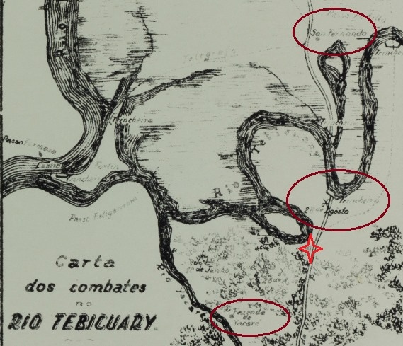 Тем временем бразильцы также заметили «Такуари», экипаж которого выгружал артиллерийские орудия вдоль западного притока. «Такуари», ранее служивший флагманом парагвайского флота, и бывший единственным военным кораблём специальной постройки, оказался в крайне уязвимом положении.