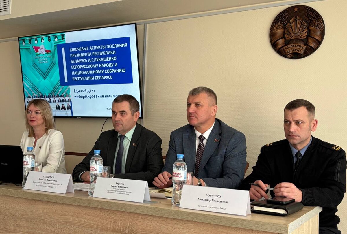 » ✅С трудовым коллективом встретилась информационно-пропагандистская группа председателя райисполкома Вячеслава Грищенко. Главной темой для обсуждения стала «Ключевые аспекты послания Президента Республики Беларусь А. Г. Лукашенко белорусскому народу и Национальному собранию Республики Беларусь» Второе заседание VII Всебелорусского народного собрания прошло в Минске 18-19 декабря. В нем принимала участие делегация Браславского района: 4 делегата и 2 приглашенных. ✅С преломлением информации на наш район В. Грищенко остановился на итогах работы прошедшей пятилетки. Затем обозначил 10 стратегических задач на ближайшую перспективу, среди которых технологический суверенитет, цифровизация, энергетическая самостоятельность, развитие агропромышленного комплекса, туризм - точка роста экономики, развитие сильных регионов и т. д. 👉Дополнили информацию ЕДИ заместитель председателя райисполкома Е. Бабинская и начальник РОВД А. Мяделко