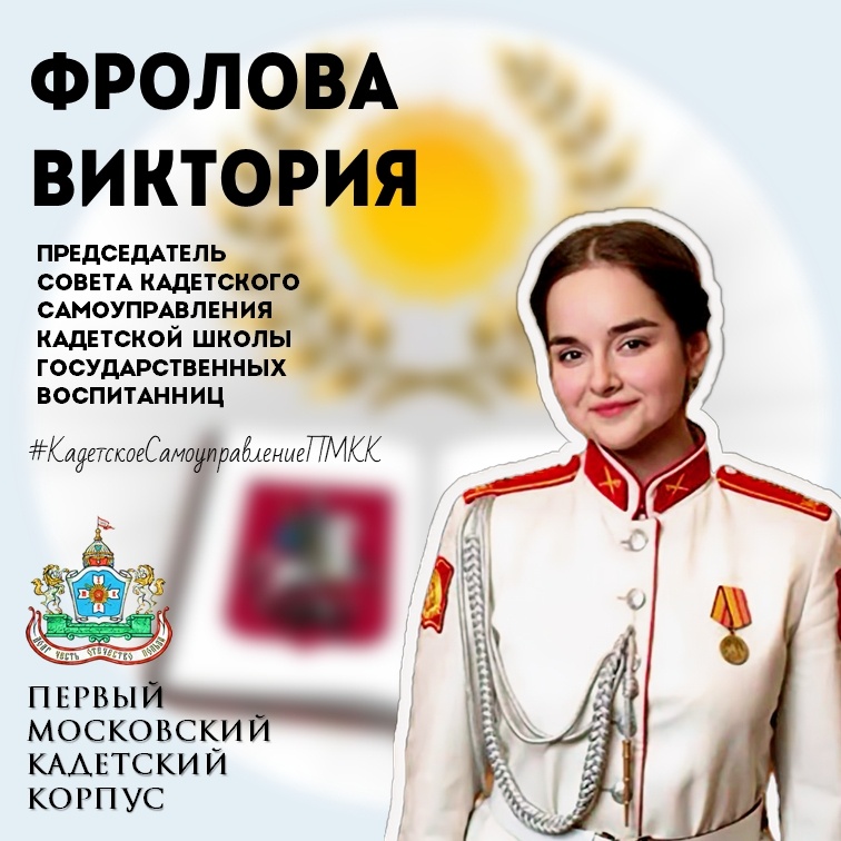 🎙 Знакомьтесь: председатель Совета кадетского самоуправления. Виктория Фролова о себе, творчестве и главных принципах. Меня зовут Виктория Фролова, я учусь в 11 «М» классе, и я являюсь председателем Совета кадетского самоуправления Кадетской школы государственных воспитанниц уже второй год. Находясь в этой должности, я поняла, что это очень ответственная деятельность, ведь перед тобой стоит важная задача — работать на благо нашего Корпуса. 🎶 Сейчас все силы отдаю подготовке к экзаменам. Но в самом напряжённом ритме жизни выпускника-кадета меня поддерживает творчество. Музыка со мной всю жизнь: я окончила музыкальную школу по классу фортепиано, а также пою в вокальном коллективе «Вдохновение», с которым мы ежегодно занимаем первые места на конкурсах. ✨ За годы учёбы в Первом Московском кадетском корпусе было много ярких событий. Особенно запомнились победа в проекте «Мы — грамотеи!» на телеканале «Культура» и участие в параде Победы на Красной площади. За отличную учёбу была награжден