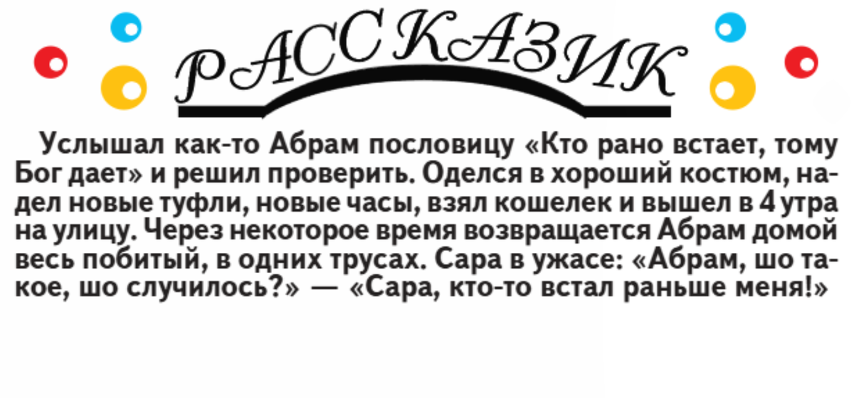 Привет! Всем вам наше здравствуйте! Привет с Одесского двора! Почему с одесского? Потому что на связи снова Зяма Шнобельсон, дедушка Зяма, рыбак и юморист, и он не против порадовать нас с вами одесским юмором. Пока есть в Чёрном море рыба, пока на одесском Привозе продаются мочёные сливы и сало шоколаде, у Одессы не пропадёт чувство юмора, а это значит, вечно. -Исаак, чем вы едите гефилте фиш? - Ой, лишь бы да! (Для справки- гефилте фиш - это фаршированная рыба). """""" Изя жалуется приятелю: - Недавно я понял, что вальс Меньдельсона тридцать лет назад испортил всю мою жизнь. - У меня есть другой приятель по фамилии Меньдельсон . - Боже мой! И как он живет с такой фамилией?! """" - Рая, я стала такой ленивой, такой ленивой, ну, прям как.... как.... крокодил. -Не поняла, Циля. А причём тут крокодил? - Я готова лёжа даже ходить. """" Привоз. - Физа, почему твои " бычки" такие пухленькие и жирненькие? - А я их грудью кормлю. """""" Разговор двух женщин: - Ой, какие шустрые ма